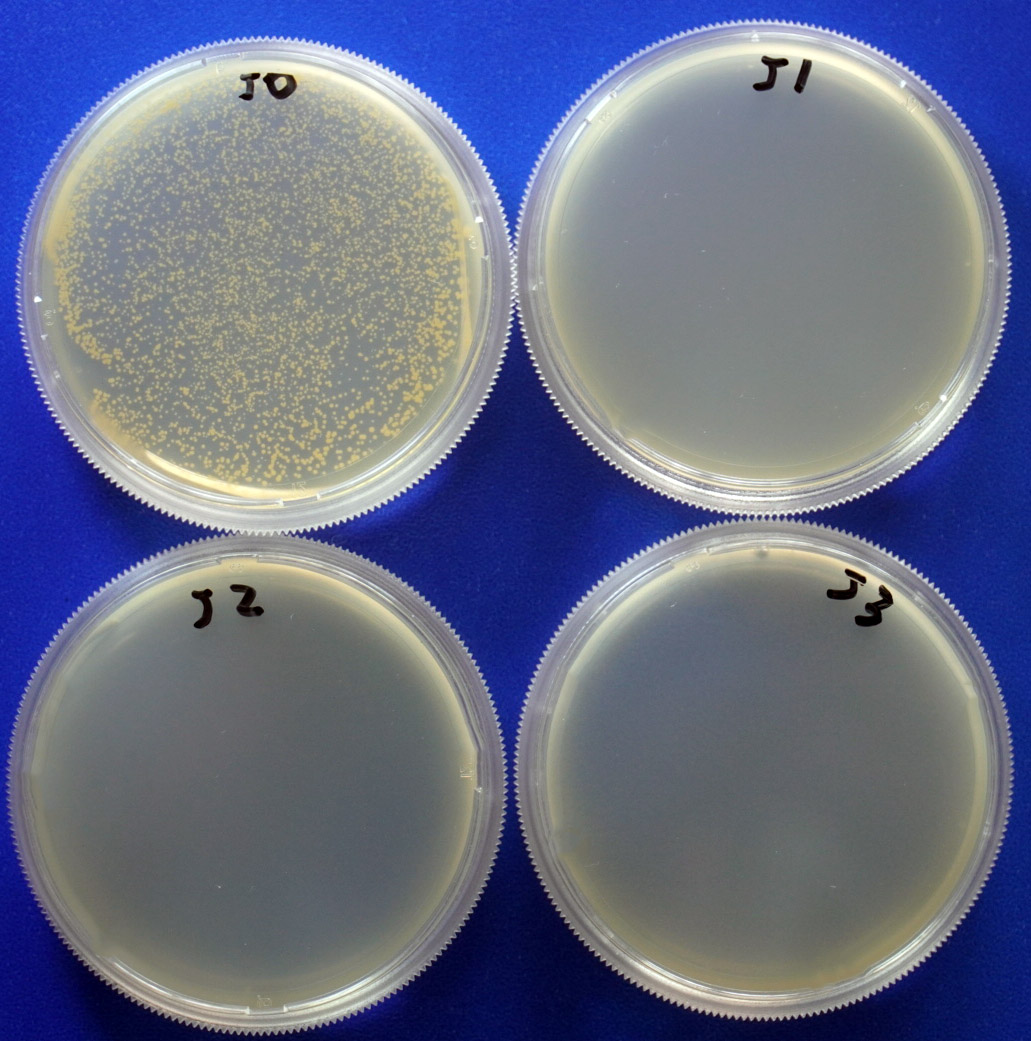 2.1. 對(duì)金黃色葡萄球菌的抑制效果(細(xì)菌) 培養(yǎng)基高壓滅菌后,冷卻并添加一定量的Buffpro 300后到平板。凝固后接種同樣菌量的金黃色葡萄球菌,37℃培養(yǎng)18h。結(jié)果如下圖:
