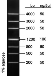 | 描述: | 由200 、500、800、1,200、2,000、3,000、4,500bp 7條雙鏈線狀DNA片段混合而成,指示帶為1200 bp. | ||