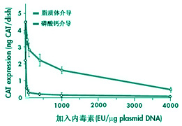 質(zhì)粒DNA加入不同濃度內(nèi)毒素,然后用脂質(zhì)體或磷酸鈣介導(dǎo)轉(zhuǎn)染至5×106個(gè)細(xì)胞,分析質(zhì)粒的轉(zhuǎn)染效率。