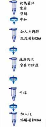 從150-250ml培養(yǎng)過夜的菌液中收集細(xì)菌后,采用傳統(tǒng)的SDS堿裂解法裂解細(xì)菌,離心去除染色體DNA和蛋白質(zhì),上清液異丙醇沉淀質(zhì)粒DNA后,經(jīng)過兩種溶液洗滌去除蛋白質(zhì)和各種雜質(zhì)后,最后用滅菌水或TE洗脫出質(zhì)粒DNA。